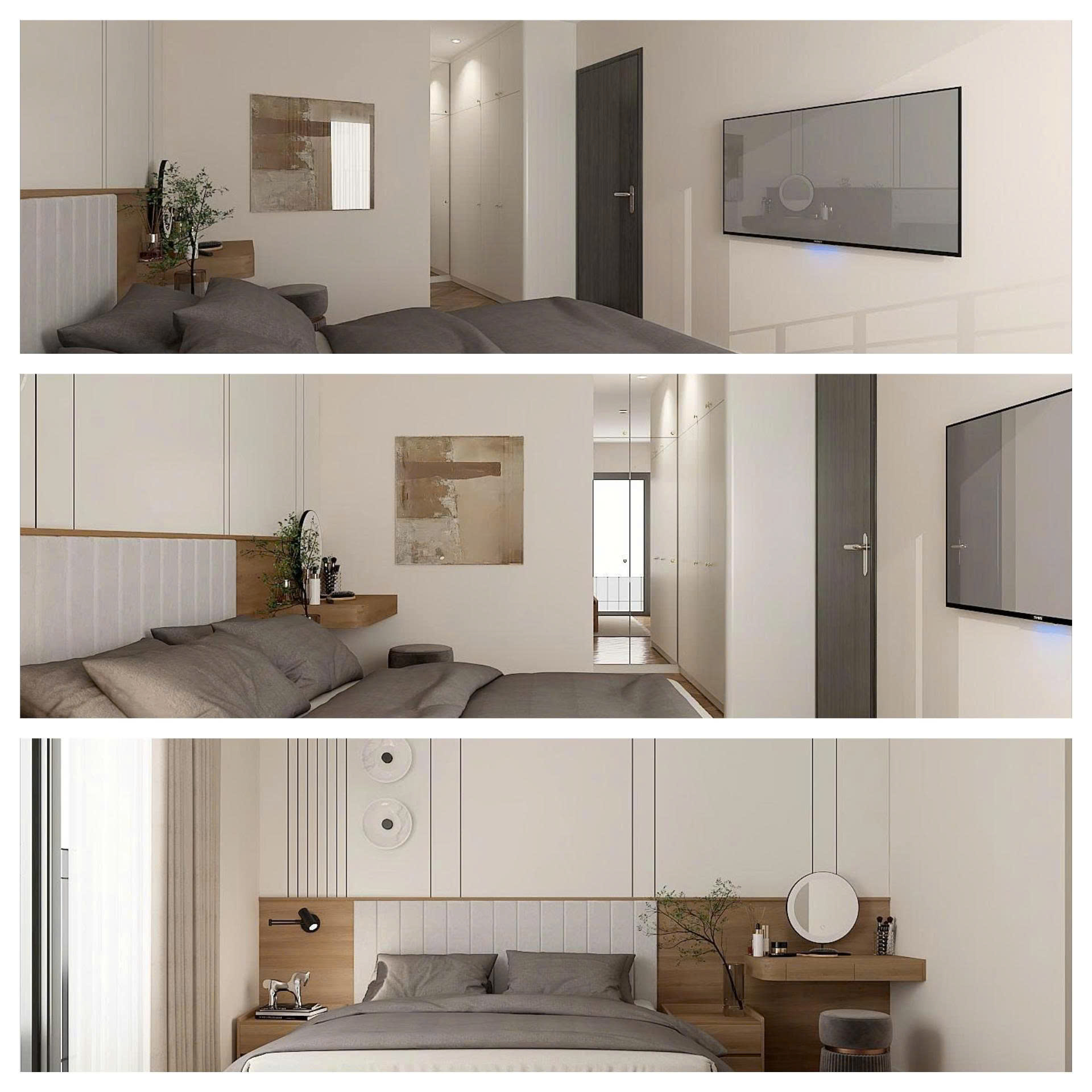 Bàn Trang Điểm/Làm Việc: Bàn trang điểm treo tường thiết kế tròn hoặc bo góc mềm mại, đi kèm gương tròn không khung, tối giản hóa không gian.